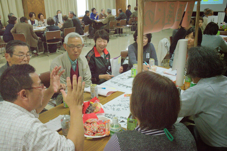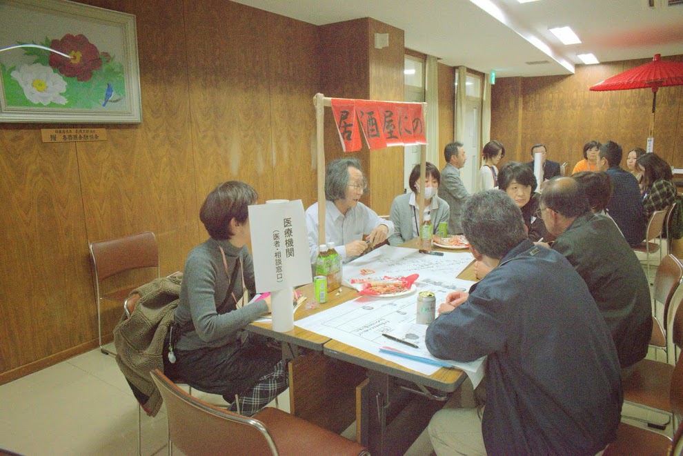 今回はグループディスカッションを通して、在宅において認知症患者さんを地域住民、民生委員の協力を得ながら、どう終末期まで支えていくのか、各テーブルに分かれて話し合う試みです。