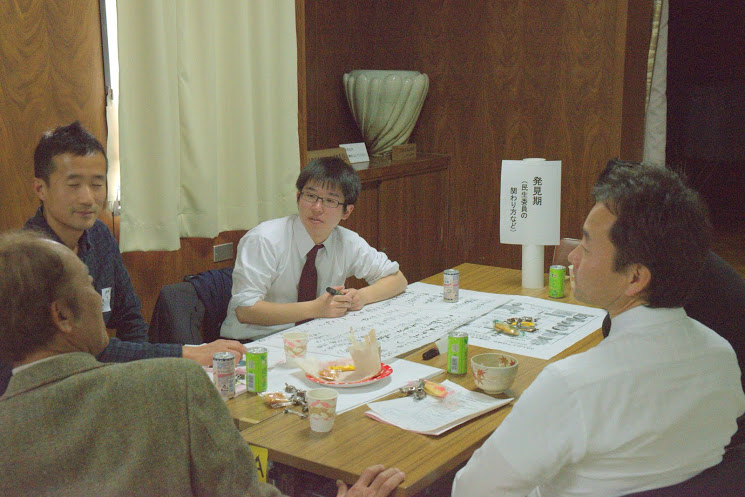 各テーブルで、簡単に自己紹介して、早速自分の意見を話してもらいます。グループに分かれて、25分間の話し合いを行ないます。