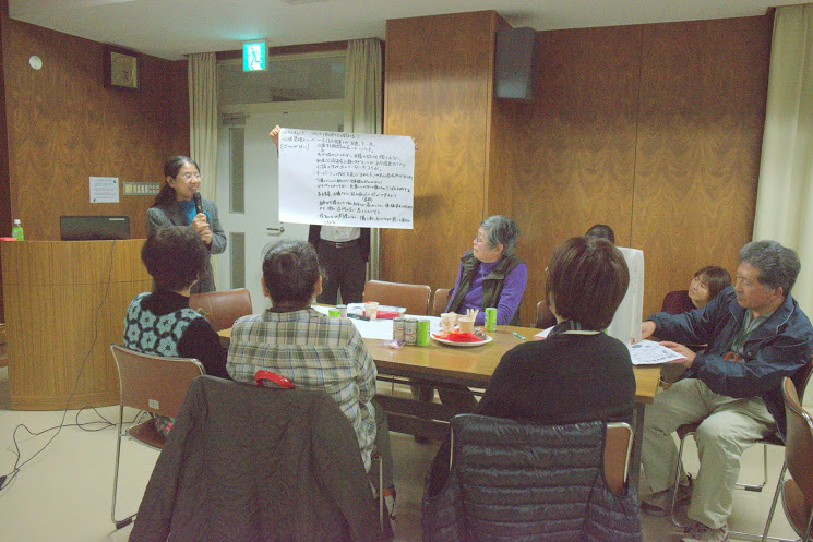 今回はグループディスカッションを通して、在宅において認知症患者さんを地域住民、民生委員の協力を得ながら、どう終末期まで支えていくのか、各テーブルに分かれて話し合う試みです。